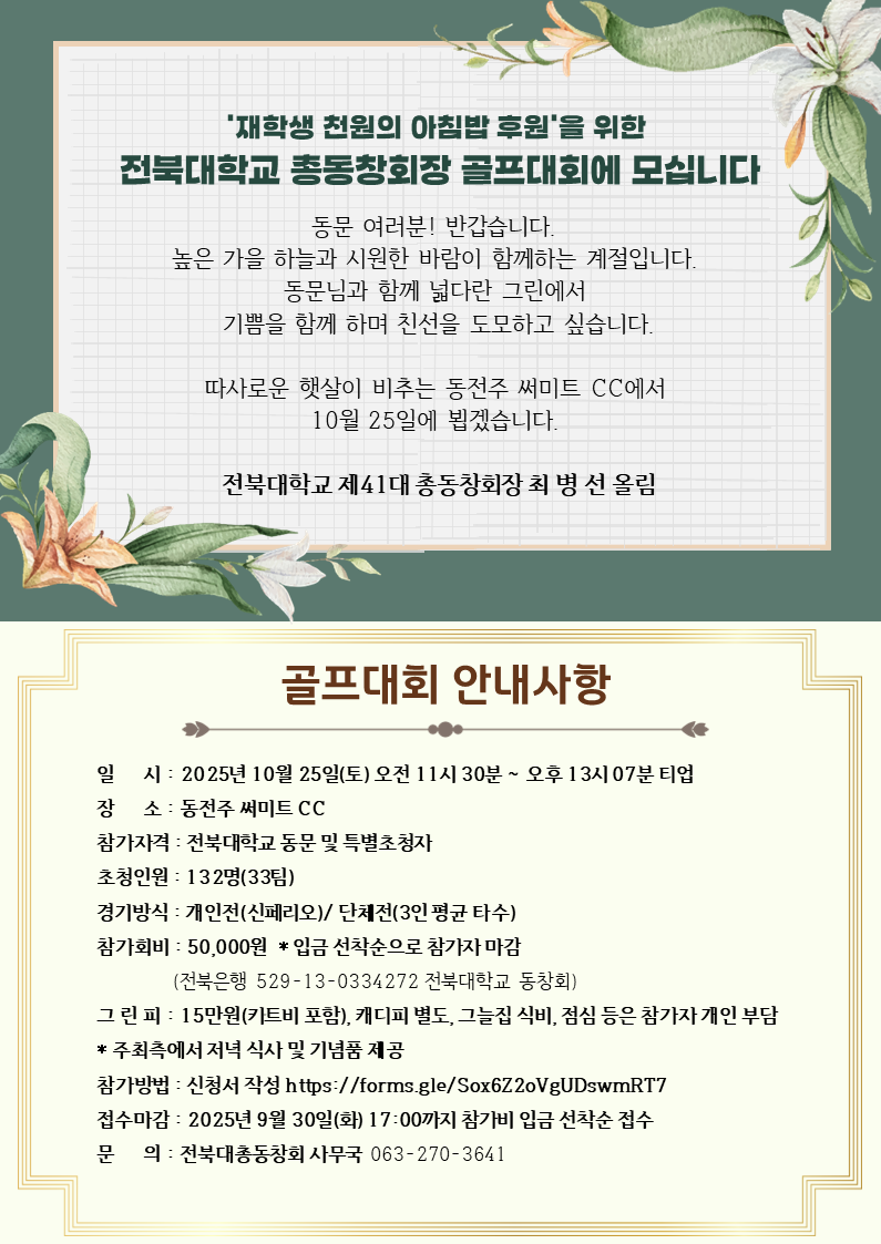 fnctId=bbs,fnctNo=4551 작성일 2025.09.10 수정일 2025.09.10 작성자 총동창회 조회수 413 '재학생 천원의 아침밥 후원'을 위한 2025 전북대학교총동창회 골프대회 안내 참가 신청서 작성>> https://forms.gle/Sox6Z2oVgUDswmRT7 첨부파일 첨부파일이(가) 없습니다.