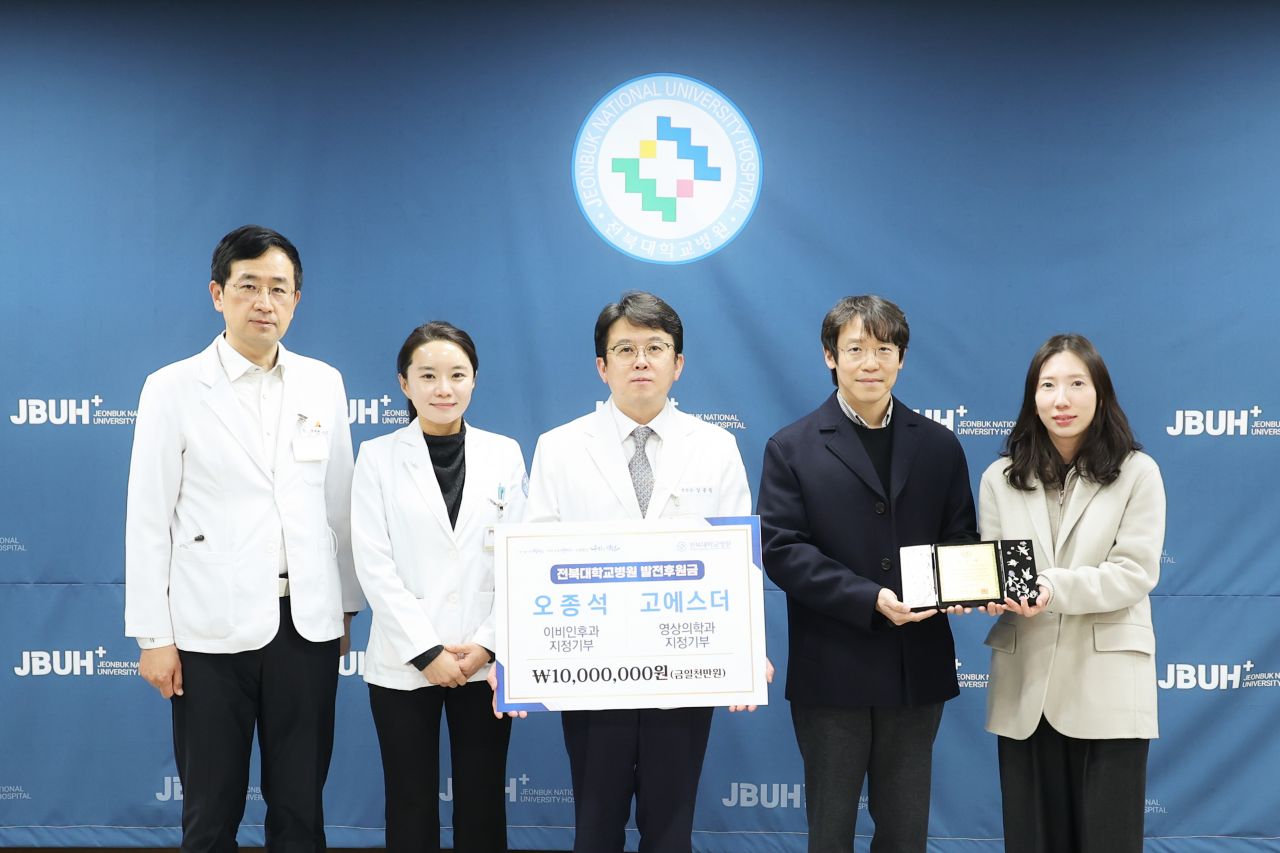 오종석·고에스더 동문이 전북대병원(병원장 양종철)에 병원 발전과 진료 환경 강화를 위해 이비인후과와 영상의학과에 각 500만원씩, 총 1천만원을 발전후원회에 기부했다.오종석·고에스더 동문은 전북대병원에서 수련과정을 마쳤으며, 이비인후과와 영상의학과 전문의로 환자 진료는 물론 의료 연구 발전에서 힘써왔다. 현재는 각각 참이비인후과 원장, 진안군의료원 영상의학과장으로 재직하며 지역사회 의료 발전에 힘쓰고 있다.