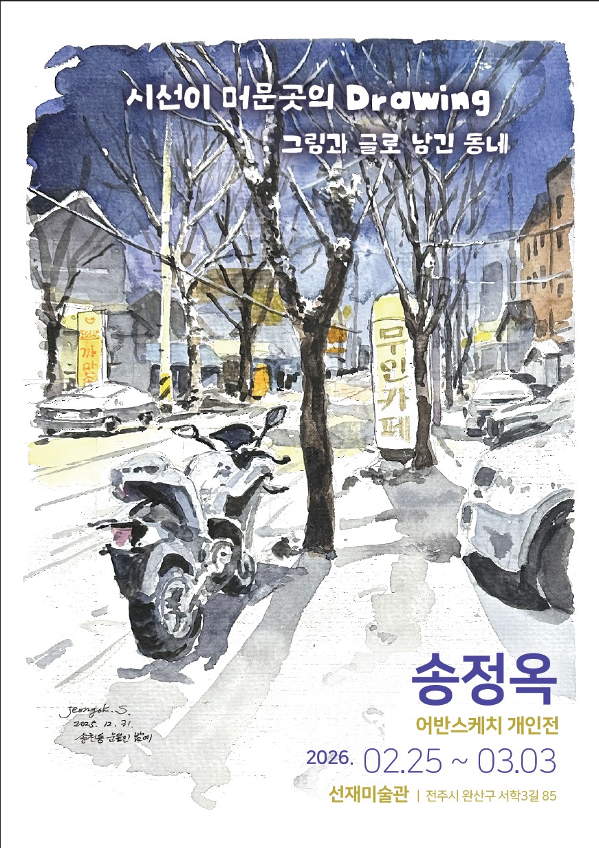 송정옥 동문 어반스케치 개인전 ‘시선이 머문 곳의 드로잉(Drawing)’이 3월 3일까지 전주 서학동예술마을 내 선재미술관에서 열린다. 전북대학교를 졸업하던 해에 고향을 떠난 작가는 30년 만에 고향으로 돌아와 13년째 살고 있다. 2년 전 친정엄마가 돌아가신 후 엄마의 발길이 닿았던 송천동 주변의 사라져가는 옛날 가게들에 마음이 가면서 하나 둘 스케치 작업을 하게 됐다. 송천동의 오래된 송천떡방앗간, 이미 사라진 신풍정육점과 신풍경로당, 나이 들어가며 점점 사라져 가는 길가 할머니노점들, 대형마트에 밀려 찾는 이가 줄어든 동네상점들까지. 작가는 그 공간들을 애정어린 시선으로 바라보며 종이위에 담아냈다. 항상 새벽을 밝혀주는 김밥집과 편의점의 불빛 또한 작가의 그림 속에서 따뜻한 온기 어린 모습으로 표현되고 있다.