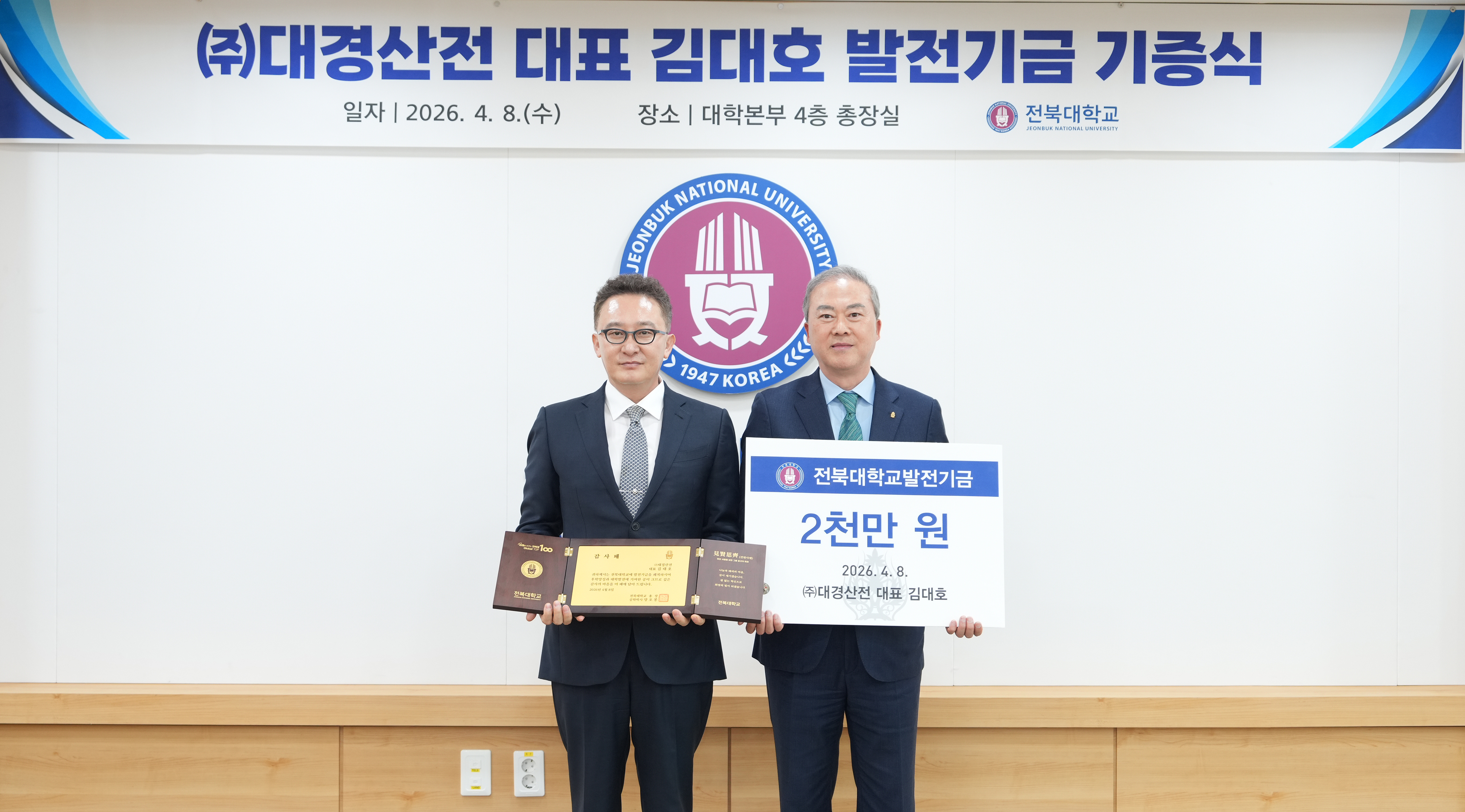 양 총장은 김 동문에게 감사의 뜻을 담은 감사패를 전달하며 “기술 혁신을 통해 국가 산업 발전에 기여하고 계신 김대호 대표님께서 후배들을 위해 고귀한 뜻을 내어주신 것에 깊이 감사드린다”며 “기탁해주신 기금은 전북대가 세계적인 인재를 키워내는 데 소중히 사용하겠다”고 답했다.